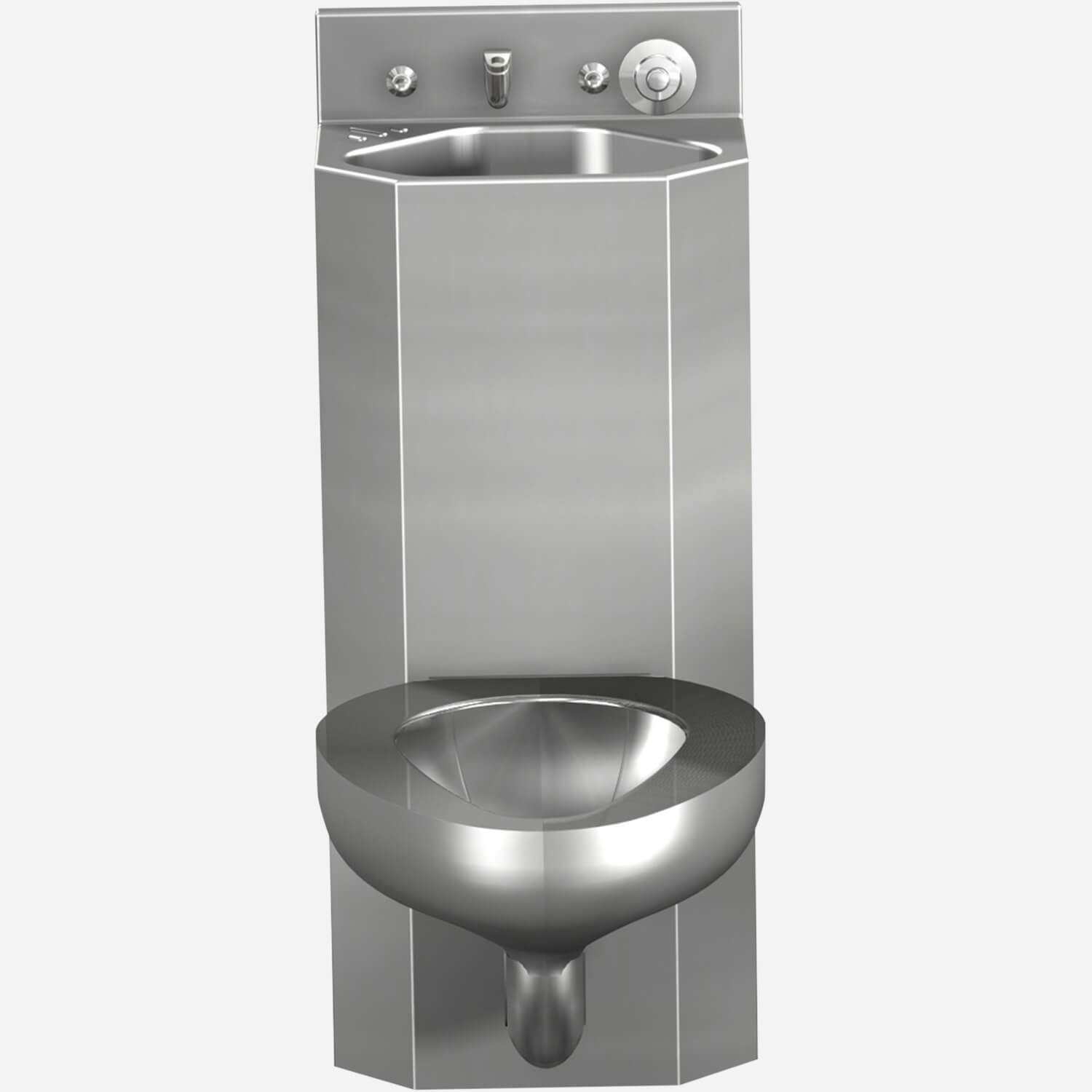 15-inch wide, 14 gage 304 stainless steel rear mounted cabinet with integral lavy/toilet; toilet requires 25 psi (172 kpa) water supply and operate with as little as 1.28 GPF (4.85 LPF) Configurations include Off-Floor, Wall Outlet (-1), On-Floor, Wall Outlet (-2), On-Floor, Floor Outlet (-3). Also, specify -AL, -AR, -CT
