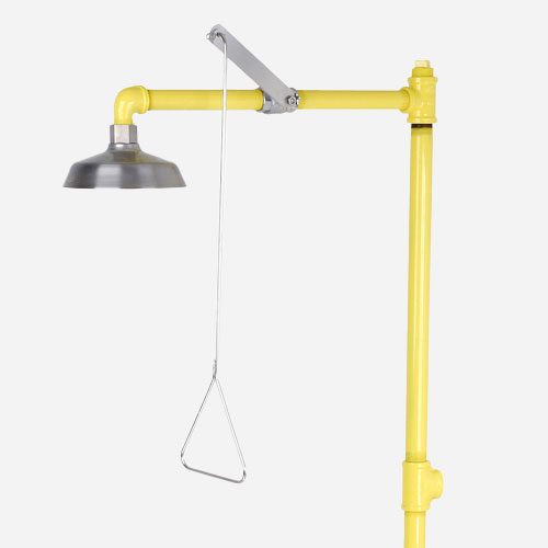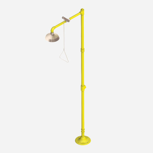 Pedestal mounted emergency shower with a plastic or stainless steel showerhead and a 1 inch stay-open ball valve with a pull rod; Schedule 40 galvanized steel piping and a 9.125 inch diameter cast iron floor flange