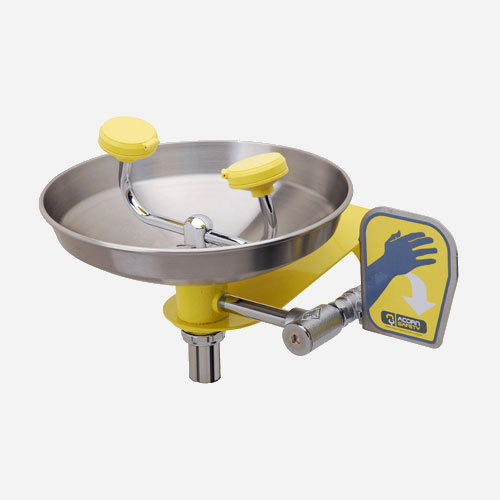 Wall mounted emergency wash station with a plastic or stainless steel bowl, ABS plastic eyewash or eye-face wash (larger) spray heads, an inline strainer and a stay-open 0.5 inch ball valve with a push handle.